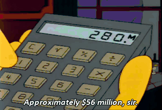 Approximately $56 million, sir. 56 million ? Don't hit me, sir. Oh, that I had the strength to take it out on you, Smithers. Now, please go. I would be alone.