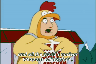 and all the world's nuclear weapons will explode, annihilating the entire planet! No! Silly rabbit! Trix are for kids. Damn long-ears, trying to take Easter away from Jesus. I--i'm Sorry. What were you sayiN'?