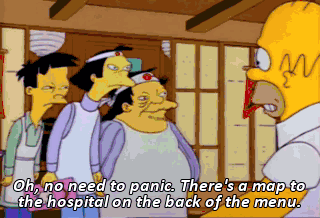 Oh, no need to panic. There's a map to the hospital on the back of the menu. "Try something new, Homer. What'll it hurt you, Homer ?"
