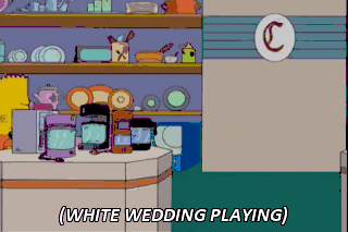 (WHITE WEDDING PLAYING) It's a nice day for a white wedding It's a nice day to start again (LAUGHING MISCHIEVOUSLY) (MUSIC STOPS)