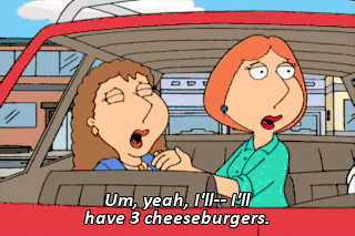 Um, yeah, I'll-- I'll have 3 cheeseburgers. Peter, For God's sake! She's having a baby! Oh, That's right. A-And a kid's meal.