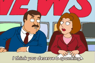 I think you deserve a spanking. I don't think your wife would appreciate that. That frigid old cow lives in quahog. She can't hear a word I'm saying. Actually, we're back on the air in quahog.