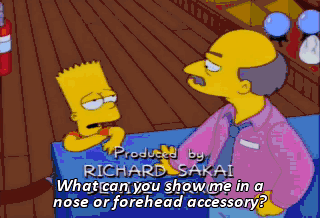 What can you show me in a nose or forehead accessory? Whoa! Lookin' sharp! Well, thanks, governor. Oh! If you put dog doo on the suction cups, they'll stick better. Milhouse, I'm not gonna take dog doo...