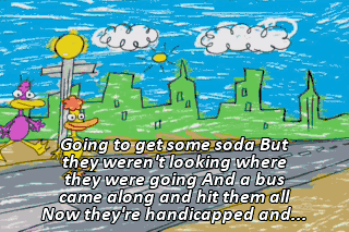 Going to get some soda But they weren't looking where they were going And a bus came along and hit them all Now they're handicapped and... No, that's pretty much it Handiquacks And they never got their soda