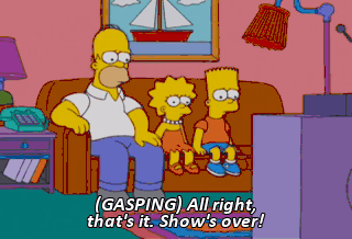 (GASPING) All right, that's it. Show's over! Five, six, so long, hicks!