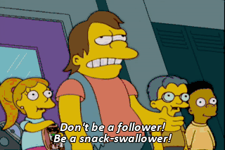 Don't be a follower! Be a snack-swallower! It's fun to obey the machine. (WHIRRING) Mmm. Mmm. Mmm. (SIGHS)