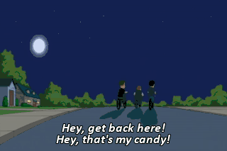 Hey, get back here! Hey, that's my candy! Damn you, that's my candy! How could this day get any worse? (EXCLAIMS)