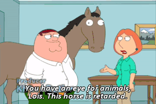 You have an eye for animals, Lois. This horse is retarded. That's why I got it so cheap. Peter, I don't think it's wise to have a retarded horse as a house pet.