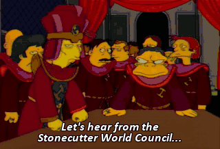 Let's hear from the Stonecutter World Council... before we act too rashly. Kill him. Kill him. kill the fool.