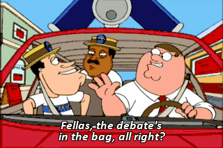 Fellas, the debate's in the bag, all right? If there's one thing I can do, it's play to a crowd.