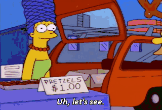 Uh, let's see. I'll have one, uh-- Hey, hurry up. I wanna get my pretzel. - One pretzel. - Thank you. Let's see, uh, I will have one of your, uh-- Come on, come on. While we're young.