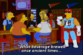 "What beverage brewed since ancient times... is made from hops and grains?" How about ancient hop grain juice? Beer! Beer! Beer! Wait, wait, wait. Homer's trying to make a guess. Beer, beer, beer!