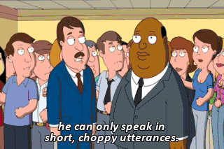 he can only speak in short, choppy utterances.