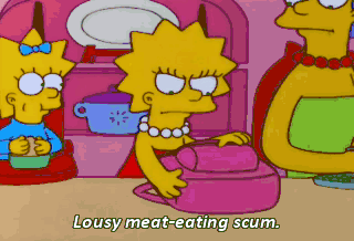 Lousy meat-eating scum. Huh? Not you. I'm going over to protest this disgusting new restaurant called The Slaughterhouse. It's decorated with hanging steer carcasses and a fountain of blood.