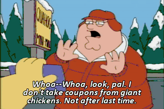 Whoa--Whoa, look, pal. I don't take coupons from giant chickens. Not after last time. Oh, yeah. And, uh, that nice chicken outside gave me this coupon. I'm sorry. This has expired. You son of a-- Ahh!