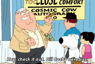Hey, check it out. Bill Cosby aerobics. (THE COSBY SHOW THEME SONG PLAYING)