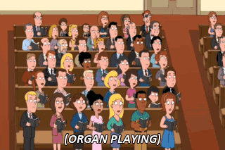 (ORGAN PLAYING) If we praise Jesus by singing all together It makes this whole exercise seem less bizarre