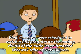 Well, Class, we were scheduled to watch a PBS program on the mating rituals of the nude large-breasted Weewok tribe of New Guinea.