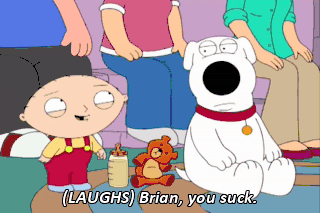 (LAUGHS) Brian, you suck. What the devil is in here? I threw out all your apple juice, Stewie. We're a gas family now. You put gasoline in Stewie's bottle? You damn fool! You're more useless than Aquaman.
