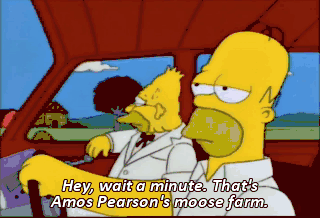 Hey, wait a minute. That's Amos Pearson's moose farm. Make a right here. Eww. Why are we stopping at this dump?