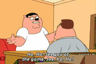 Ho, Ho! See you at the game, Joe. ho, Ho! Hey, you want a piece of gum? Oh, Thanks. Ha ha! That was joke gum. What do you mean? Now you're addicted to heroin. I'm cold. Hey, Peter!