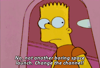 No, not another boring space launch. Change the channel! Change the channel! I can't! I can't!