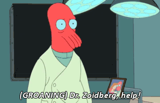 (GROANING) Dr. Zoidberg, help! Bender? What happened to your leg tube? I got beat up by a little girl. Please. Fix my knee, so I can get revenge at the tap-dance championship!
