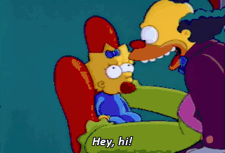 Hey, hi! Cute kid. Oh, hi, Bart. I was just in the neighborhood... What? Krusty the Clown! What a surprise! Milhouse, you can come in, and drop the charade.