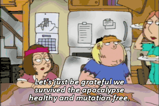 Let's just be grateful we survived the apocalypse healthy and mutation free. I said I can do it.