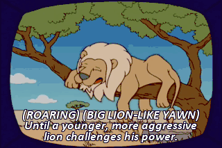(ROARING) (BIG LION-LIKE YAWN) Until a younger, more aggressive lion challenges his power. (WHIMPERS) (WHIMPERS) (GRUNTS) Oh. The couch is like that tree!