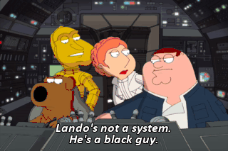 Lando's not a system. He's a black guy. In fact, I think he might be the only black guy in the galaxy. (CHUCKLES) Let's hope, right? ALL: Whoa!