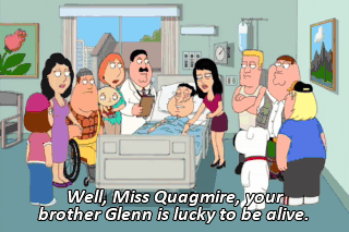 Well, Miss Quagmire, your brother Glenn is lucky to be alive. You know, we're all lucky to be alive on such a beautiful day. In fact, nurse, all surgeries are outside today.