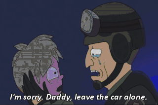 I'm sorry. Daddy, leave the car alone. W-W-W-Wh at? Leave the car alone. Hunter? Don't -- Oh, my god, Stay here, Hunter! No! God, no! Hunter!