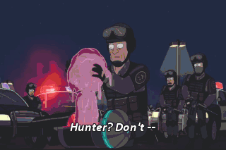 Hunter? Don't -- Oh, my god, Stay here, Hunter! No! God, no! Hunter!