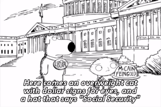 Here comes an overweight cat with dollar signs for eyes, and a hat that says "Social Security"