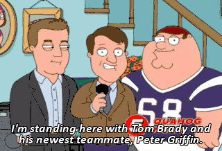 I'm standing here with Tom Brady and his newest teammate, Peter Griffin. Hey, Ma! Check it out! I'm married to a pro athlete! What do you think of that? (LAUGHING)