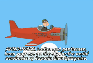 ANNOUNCER: Ladies and gentlemen, keep your eye on the sky for the aerial acrobatics of Captain Glen Quagmire.