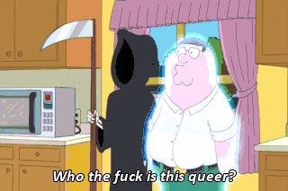 Who the fuck is this queer? That's you, Peter, alcohol-free. (BOTH LAUGHING) Hey, look, there's Joe and Quagmire. Hey, let's have a drink with them.