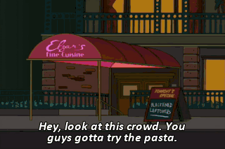 Hey, look at this crowd. You guys gotta try the pasta. It's got a real nice profit margin.
