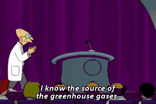 I know the source of the greenhouse gases. But in my shame, I've kept it secret for 75 long years. Oh, it haunts my memory still. Professor, no! Don't do it! Don't do what?