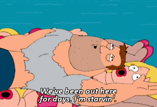 We've been out here for days. I'm starvin'. Hey, what's that? Where? What? You're eatin' somethin'. You bastard! You have food? I don't know what you're talkin' about. Give me that.