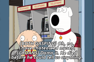 (BOTH GASPING) Oh, no. I have chateau'ed myself. (GROANS) Damn it. He died before he could tell us anything.