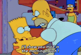 I'll show you mad in the morning ! Gah ! Homer, you encouraged him ! You should be strangling yourself ! She's right ! Okay, think, Homer. Don't panic. They don't pick up the mail till noon.