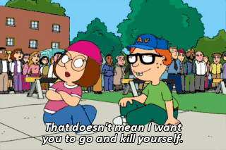 That doesn't mean I want you to go and kill yourself. Ah, Thanks, Meg. But I was never really planning to jump. Wasn't gonna jump? You're a phony! Hey, everybody! This guy's a great big phony!