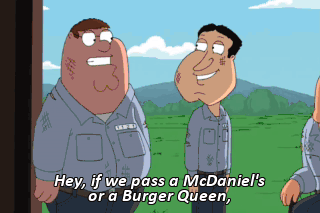 Hey, if we pass a McDaniel's or a Burger Queen,