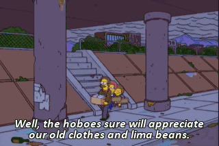 Well, the hoboes sure will appreciate our old clothes and lima beans.