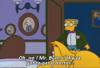 Oh, no ! Mr. Burns ! We've got to get a doctor ! Absolutely not ! No quack sawbones is going to apply his leeches to me ! As long as there's an ounce of strength left in me, I--