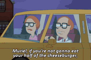 Muriel, if you're not gonna eat your half of the cheeseburger, I'll see if they have a freezer so I can keep it nice. I'm gonna walk around, I think my vagina's asleep.