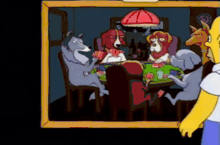 They're dogs, and they're playing poker! Aaah! We had a story to go with this painting, but it was far too intense.