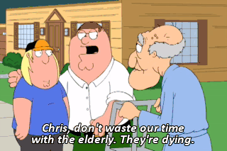 Chris, don't waste our time with the elderly. They're dying. Please, God, let me just sniff his hat. Let me just sniff his hat, that's all I want.